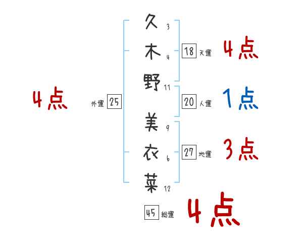 総運![]() | 久木野美衣菜さんの総運は45画の4つ星!もくもくと物事を進め達成する。地味な努力家。 あなたの人生を表す1番重要な運勢です。生涯を通じて影響する総合運となり、主に50歳以降の晩年期に影響を及ぼします。 |