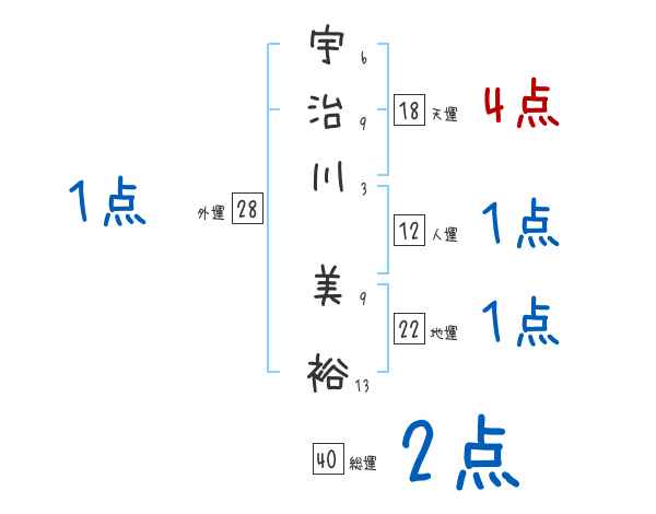 天運![]() | 宇治川美裕さんの天運は18画の4つ星!情熱的で剛気。忍耐力があり信頼される。 家系が持つ宿命的な運勢を表します。祖先から受け継いだ苗字ですので自分の力が及びません。家柄を象徴します。 |