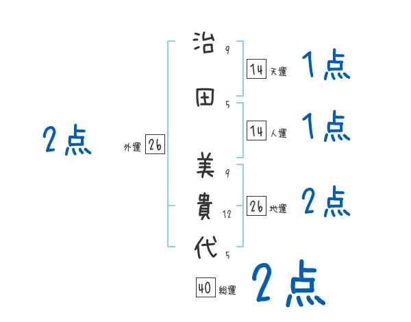 外運![]() | 治田美貴代さんの外運は26画の2つ星!波瀾万丈かも。信頼できる人を大事にしましょう。 生活面を象徴する運勢です。外部から受ける影響力を表し、結婚運、家庭運や職場、環境への順応性を表します。 |