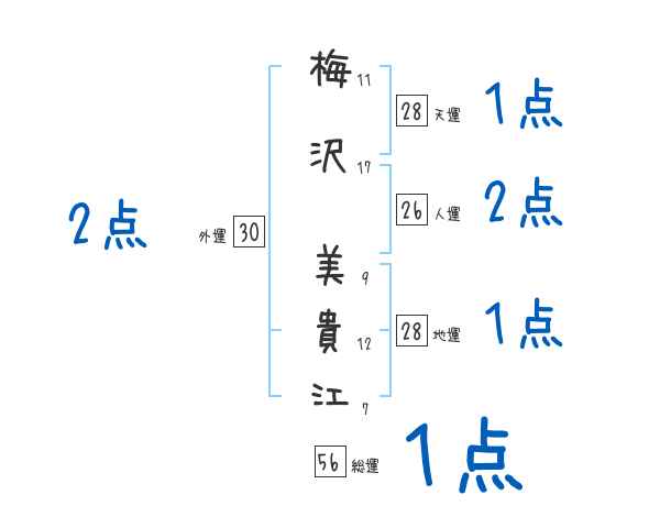 | 人運  | 梅沢美貴江さんの人運は26画の2つ星!波瀾万丈かも。信頼できる人を大事にしましょう。性格や才能などを表す2番目に重要な運勢です。人間関係や協調性、社会的な成功に影響します。主に20歳から50歳ぐらいまでの中年期の運勢を表します。 |