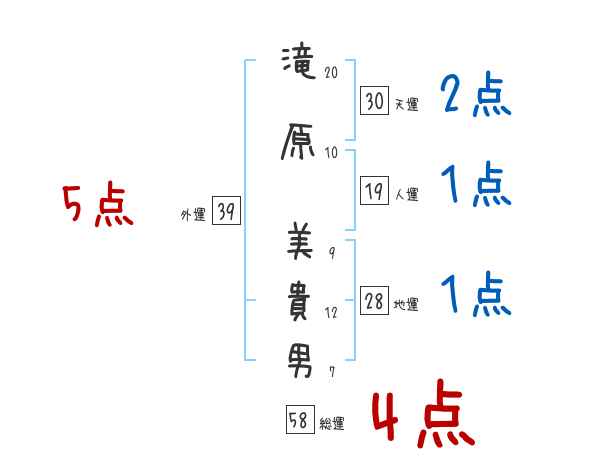 外運![]() | 滝原美貴男さんの外運は39画の5つ星!社交性に優れ人望が厚い。人の上に立ち成功する。 生活面を象徴する運勢です。外部から受ける影響力を表し、結婚運、家庭運や職場、環境への順応性を表します。 |