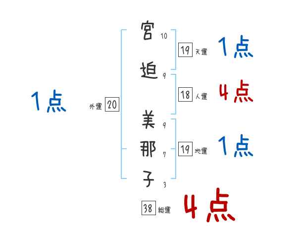 人運![]() | 宮迫美那子さんの人運は18画の4つ星!情熱的で剛気。忍耐力があり信頼される。 性格や才能などを表す2番目に重要な運勢です。人間関係や協調性、社会的な成功に影響します。主に20歳から50歳ぐらいまでの中年期の運勢を表します。 |