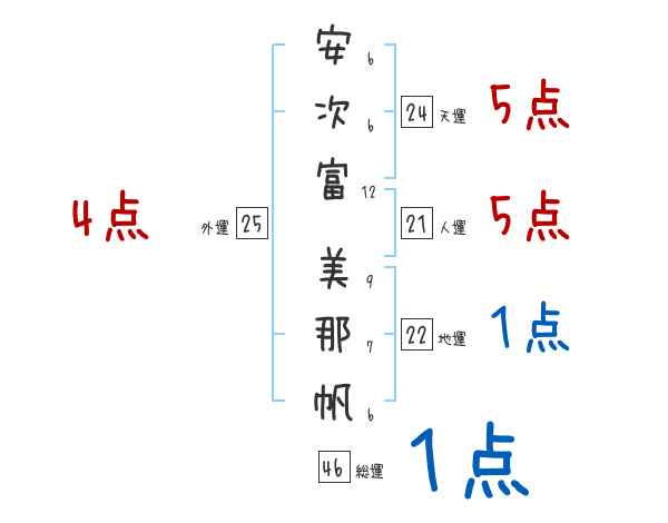 天運![]() | 安次富美那帆さんの天運は24画の5つ星!家庭運が良く順調な人生。金運にも恵まれる。 家系が持つ宿命的な運勢を表します。祖先から受け継いだ苗字ですので自分の力が及びません。家柄を象徴します。 |