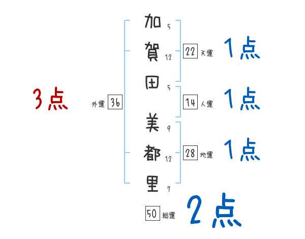 天運![]() | 加賀田美都里さんの天運は22画の1つ星!努力することが苦手ないっぽう手先が器用。芸術性にも優れる。 家系が持つ宿命的な運勢を表します。祖先から受け継いだ苗字ですので自分の力が及びません。家柄を象徴します。 |