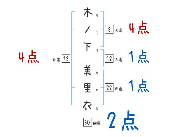 天運![]() | 木ノ下美里衣さんの天運は8画の4つ星!勤勉家。根気強く努力し成功する。忍耐力がある。 家系が持つ宿命的な運勢を表します。祖先から受け継いだ苗字ですので自分の力が及びません。家柄を象徴します。 |