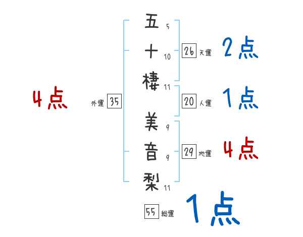 地運![]() | 五十棲美音梨さんの地運は29画の4つ星!完全主義で才能がある。厳格な心の持ち主。 個性を表す基礎的な運勢です。性格形成や対人関係、行動力など家庭環境に影響されます。主に誕生してから20歳くらいまでの若年期の運勢を表します。 |