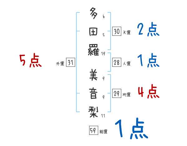 天運![]() | 多田羅美音梨さんの天運は30画の2つ星!浮き沈みの激しさに注意しましょう。 家系が持つ宿命的な運勢を表します。祖先から受け継いだ苗字ですので自分の力が及びません。家柄を象徴します。 |