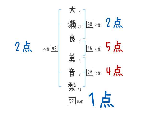 人運![]() | 大瀬良美音梨さんの人運は16画の5つ星!人望が厚く大きく発展する。逆転成功が見える。 性格や才能などを表す2番目に重要な運勢です。人間関係や協調性、社会的な成功に影響します。主に20歳から50歳ぐらいまでの中年期の運勢を表します。 |