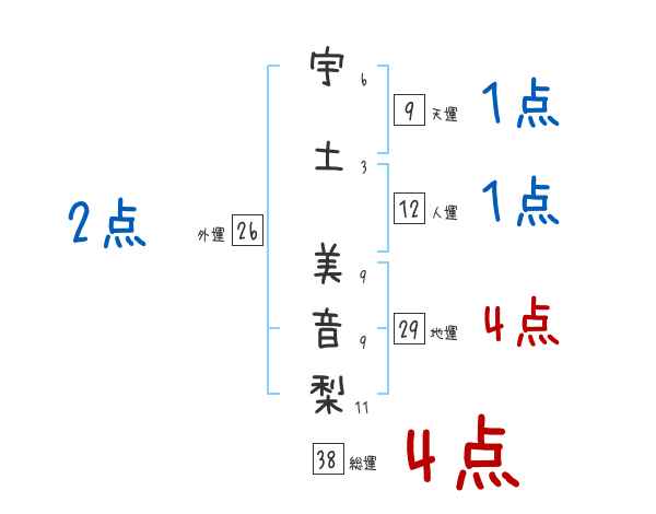 外運![]() | 宇土美音梨さんの外運は26画の2つ星!波瀾万丈かも。信頼できる人を大事にしましょう。 生活面を象徴する運勢です。外部から受ける影響力を表し、結婚運、家庭運や職場、環境への順応性を表します。 |