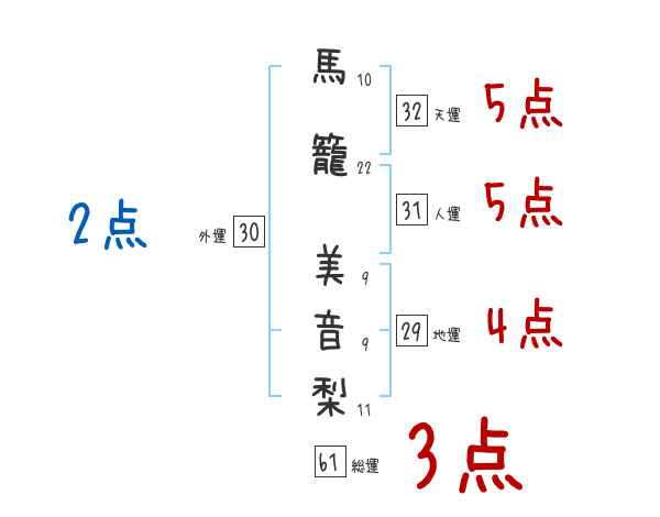 天運![]() | 馬籠美音梨さんの天運は32画の5つ星!柔軟性があり成功する。チャンスが多く金運が良い。 家系が持つ宿命的な運勢を表します。祖先から受け継いだ苗字ですので自分の力が及びません。家柄を象徴します。 |