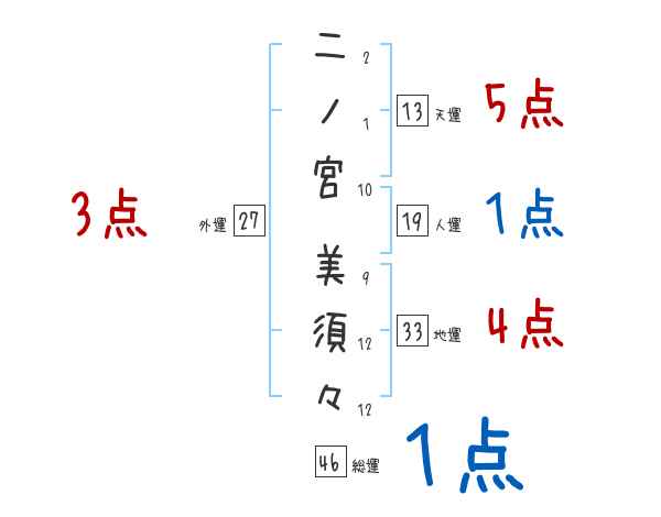 人運![]() | 二ノ宮美須々さんの人運は19画の1つ星!優れた才能を持ちますが、協調性が足りないことも。周りの人と協力する事を意識しましょう。 性格や才能などを表す2番目に重要な運勢です。人間関係や協調性、社会的な成功に影響します。主に20歳から50歳ぐらいまでの中年期の運勢を表します。 |