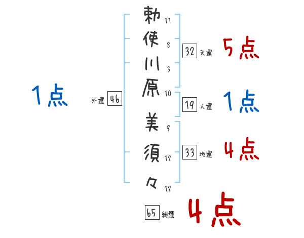 天運![]() | 勅使川原美須々さんの天運は32画の5つ星!柔軟性があり成功する。チャンスが多く金運が良い。 家系が持つ宿命的な運勢を表します。祖先から受け継いだ苗字ですので自分の力が及びません。家柄を象徴します。 |