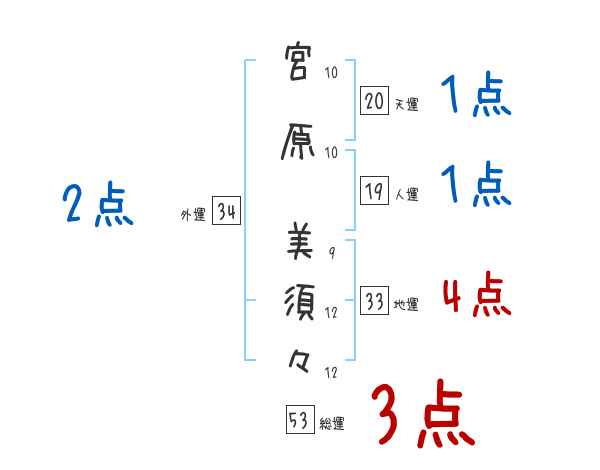 外運![]() | 宮原美須々さんの外運は34画の2つ星!独創性に優れるが、自尊心が強く災難に注意しましょう。 生活面を象徴する運勢です。外部から受ける影響力を表し、結婚運、家庭運や職場、環境への順応性を表します。 |