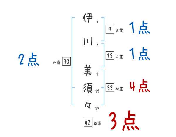 外運![]() | 伊川美須々さんの外運は30画の2つ星!浮き沈みの激しさに注意しましょう。 生活面を象徴する運勢です。外部から受ける影響力を表し、結婚運、家庭運や職場、環境への順応性を表します。 |