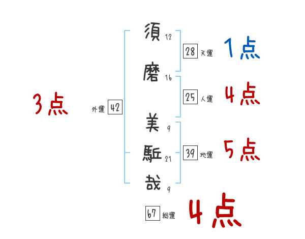 天運![]() | 須磨美駈哉さんの天運は28画の1つ星!家庭環境に注意。スポーツで活躍できる能力があるかも。 家系が持つ宿命的な運勢を表します。祖先から受け継いだ苗字ですので自分の力が及びません。家柄を象徴します。 |