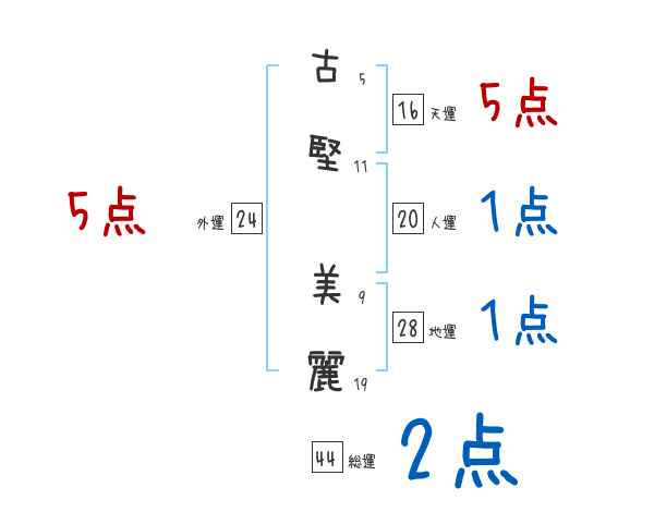 天運![]() | 古堅美麗さんの天運は16画の5つ星!人望が厚く大きく発展する。逆転成功が見える。 家系が持つ宿命的な運勢を表します。祖先から受け継いだ苗字ですので自分の力が及びません。家柄を象徴します。 |