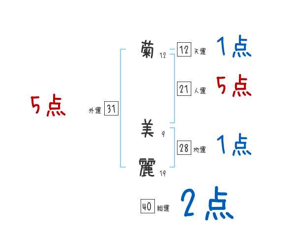 人運![]() | 菊美麗さんの人運は21画の5つ星!統率力がある。独立し成功する。名誉を手に入れる。 性格や才能などを表す2番目に重要な運勢です。人間関係や協調性、社会的な成功に影響します。主に20歳から50歳ぐらいまでの中年期の運勢を表します。 |