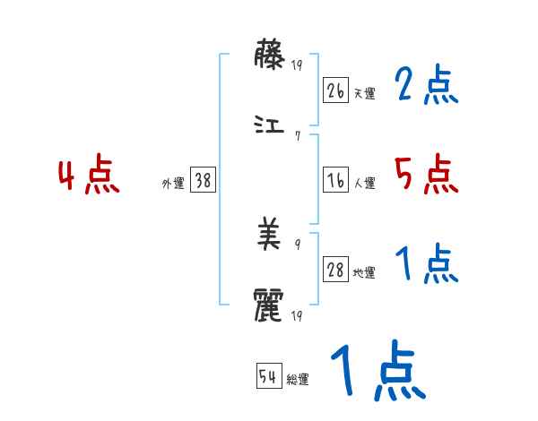 人運![]() | 藤江美麗さんの人運は16画の5つ星!人望が厚く大きく発展する。逆転成功が見える。 性格や才能などを表す2番目に重要な運勢です。人間関係や協調性、社会的な成功に影響します。主に20歳から50歳ぐらいまでの中年期の運勢を表します。 |