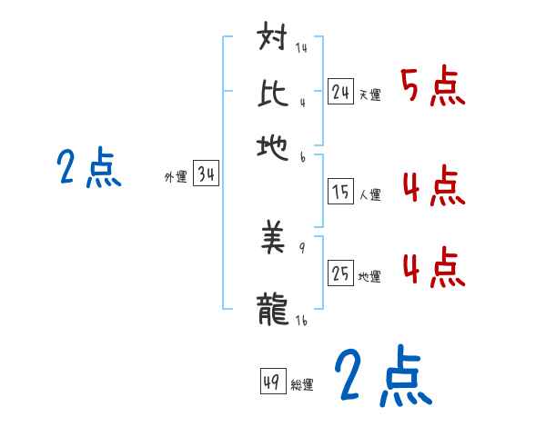 天運![]() | 対比地美龍さんの天運は24画の5つ星!家庭運が良く順調な人生。金運にも恵まれる。 家系が持つ宿命的な運勢を表します。祖先から受け継いだ苗字ですので自分の力が及びません。家柄を象徴します。 |