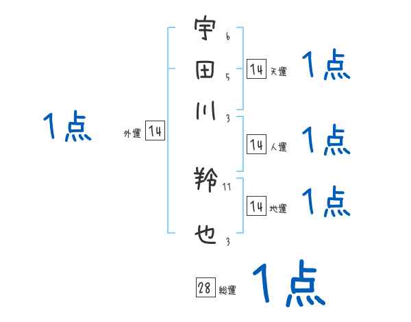天運![]() | 宇田川羚也さんの天運は14画の1つ星!人に対して優しいがストレスを溜め込みがち。人間関係のトラブルを避けるよう気をつけましょう。 家系が持つ宿命的な運勢を表します。祖先から受け継いだ苗字ですので自分の力が及びません。家柄を象徴します。 |
