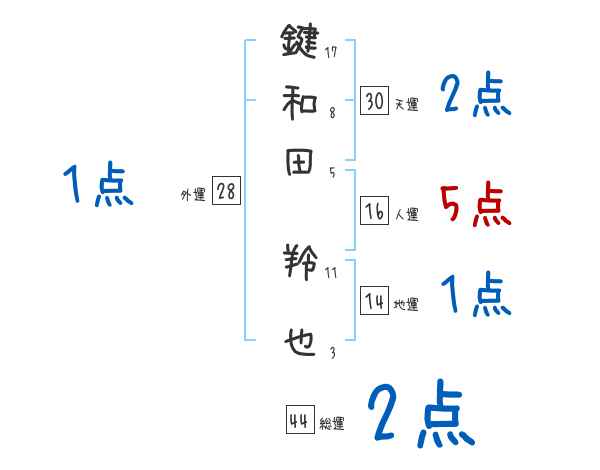 人運![]() | 鍵和田羚也さんの人運は16画の5つ星!人望が厚く大きく発展する。逆転成功が見える。 性格や才能などを表す2番目に重要な運勢です。人間関係や協調性、社会的な成功に影響します。主に20歳から50歳ぐらいまでの中年期の運勢を表します。 |