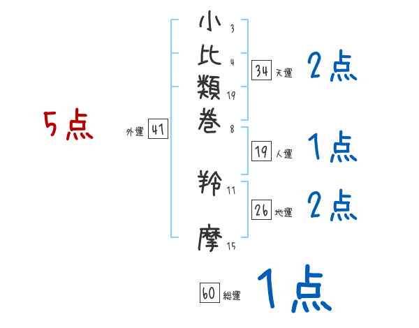 天運![]() | 小比類巻羚摩さんの天運は34画の2つ星!独創性に優れるが、自尊心が強く災難に注意しましょう。 家系が持つ宿命的な運勢を表します。祖先から受け継いだ苗字ですので自分の力が及びません。家柄を象徴します。 |