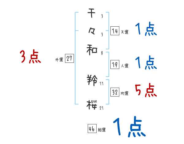 天運![]() | 千々和羚桜さんの天運は14画の1つ星!人に対して優しいがストレスを溜め込みがち。人間関係のトラブルを避けるよう気をつけましょう。 家系が持つ宿命的な運勢を表します。祖先から受け継いだ苗字ですので自分の力が及びません。家柄を象徴します。 |