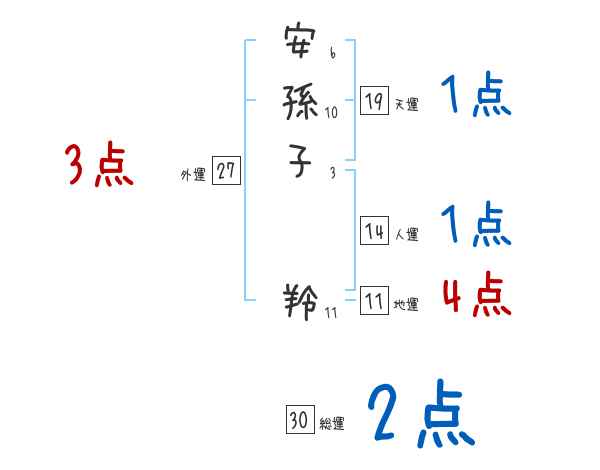 総運![]() | 安孫子羚さんの総運は30画の2つ星!浮き沈みの激しさに注意しましょう。 あなたの人生を表す1番重要な運勢です。生涯を通じて影響する総合運となり、主に50歳以降の晩年期に影響を及ぼします。 |