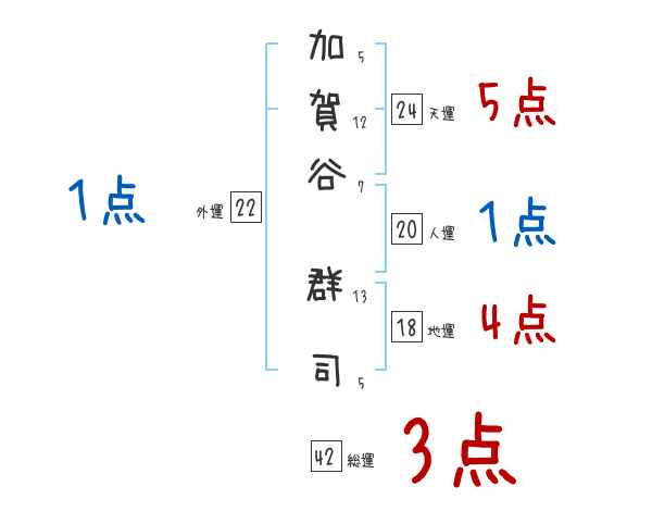 天運![]() | 加賀谷群司さんの天運は24画の5つ星!家庭運が良く順調な人生。金運にも恵まれる。 家系が持つ宿命的な運勢を表します。祖先から受け継いだ苗字ですので自分の力が及びません。家柄を象徴します。 |