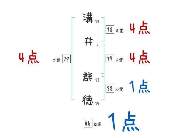 天運![]() | 溝井群徳さんの天運は18画の4つ星!情熱的で剛気。忍耐力があり信頼される。 家系が持つ宿命的な運勢を表します。祖先から受け継いだ苗字ですので自分の力が及びません。家柄を象徴します。 |