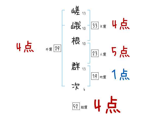 人運![]() | 嵯峨根群次さんの人運は23画の5つ星!想像力に優れ活力がある。一代で成功し名誉を手に入れる。 性格や才能などを表す2番目に重要な運勢です。人間関係や協調性、社会的な成功に影響します。主に20歳から50歳ぐらいまでの中年期の運勢を表します。 |