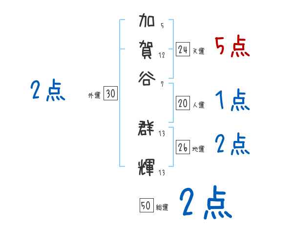 天運![]() | 加賀谷群輝さんの天運は24画の5つ星!家庭運が良く順調な人生。金運にも恵まれる。 家系が持つ宿命的な運勢を表します。祖先から受け継いだ苗字ですので自分の力が及びません。家柄を象徴します。 |