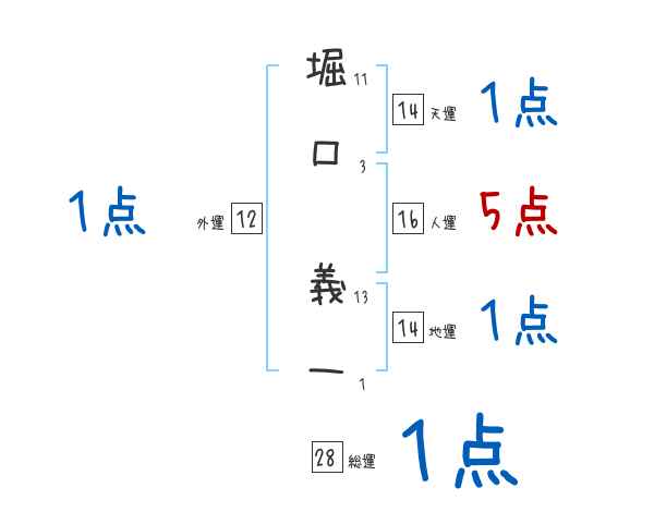 総運![]() | 堀口義一さんの総運は28画の1つ星!家庭環境に注意。スポーツで活躍できる能力があるかも。 あなたの人生を表す1番重要な運勢です。生涯を通じて影響する総合運となり、主に50歳以降の晩年期に影響を及ぼします。 |