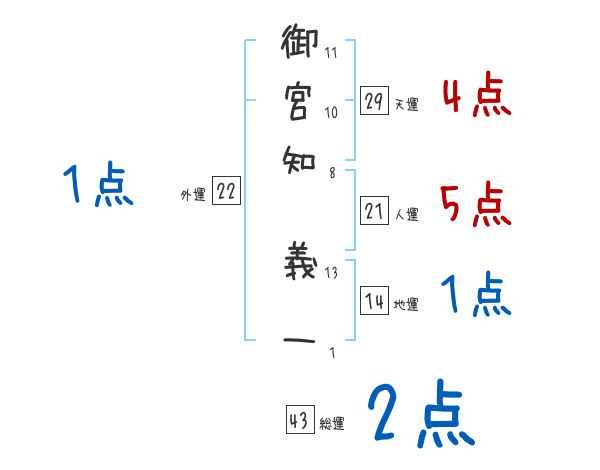 総運![]() | 御宮知義一さんの総運は43画の2つ星!頑固な性格で独立心が強いかも。やや非現実的で浪費に注意しましょう。 あなたの人生を表す1番重要な運勢です。生涯を通じて影響する総合運となり、主に50歳以降の晩年期に影響を及ぼします。 |