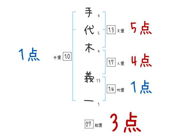 天運![]() | 手代木義一さんの天運は13画の5つ星!才能に恵まれ人気がある。名声を手に入れる。円満な人生。 家系が持つ宿命的な運勢を表します。祖先から受け継いだ苗字ですので自分の力が及びません。家柄を象徴します。 |