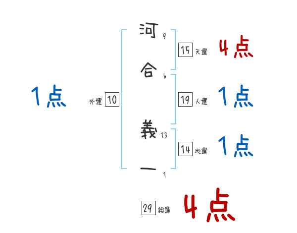 総運![]() | 河合義一さんの総運は29画の4つ星!完全主義で才能がある。厳格な心の持ち主。 あなたの人生を表す1番重要な運勢です。生涯を通じて影響する総合運となり、主に50歳以降の晩年期に影響を及ぼします。 |