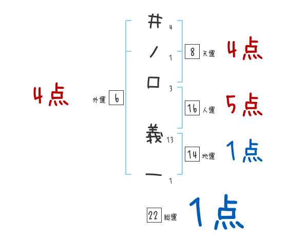 人運![]() | 井ノ口義一さんの人運は16画の5つ星!人望が厚く大きく発展する。逆転成功が見える。 性格や才能などを表す2番目に重要な運勢です。人間関係や協調性、社会的な成功に影響します。主に20歳から50歳ぐらいまでの中年期の運勢を表します。 |