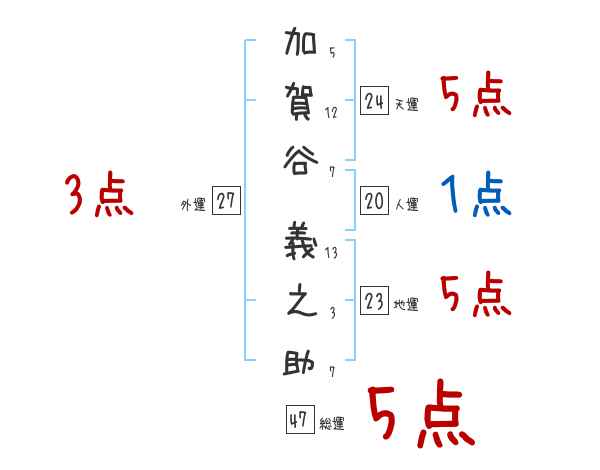 天運![]() | 加賀谷義之助さんの天運は24画の5つ星!家庭運が良く順調な人生。金運にも恵まれる。 家系が持つ宿命的な運勢を表します。祖先から受け継いだ苗字ですので自分の力が及びません。家柄を象徴します。 |