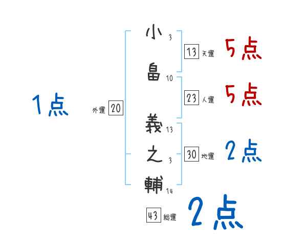 総運![]() | 小畠義之輔さんの総運は43画の2つ星!頑固な性格で独立心が強いかも。やや非現実的で浪費に注意しましょう。 あなたの人生を表す1番重要な運勢です。生涯を通じて影響する総合運となり、主に50歳以降の晩年期に影響を及ぼします。 |