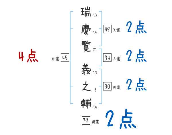 天運![]() | 瑞慶覧義之輔さんの天運は49画の2つ星!不安定な性格で明暗がある人生。周りの人には支援されやすい。 家系が持つ宿命的な運勢を表します。祖先から受け継いだ苗字ですので自分の力が及びません。家柄を象徴します。 |
