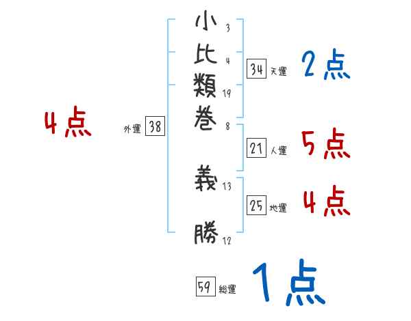 天運![]() | 小比類巻義勝さんの天運は34画の2つ星!独創性に優れるが、自尊心が強く災難に注意しましょう。 家系が持つ宿命的な運勢を表します。祖先から受け継いだ苗字ですので自分の力が及びません。家柄を象徴します。 |