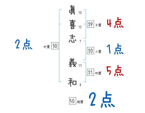 天運![]() | 眞喜志義和さんの天運は29画の4つ星!完全主義で才能がある。厳格な心の持ち主。 家系が持つ宿命的な運勢を表します。祖先から受け継いだ苗字ですので自分の力が及びません。家柄を象徴します。 |