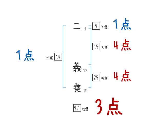 外運![]() | 二義堯さんの外運は14画の1つ星!人に対して優しいがストレスを溜め込みがち。人間関係のトラブルを避けるよう気をつけましょう。 生活面を象徴する運勢です。外部から受ける影響力を表し、結婚運、家庭運や職場、環境への順応性を表します。 |