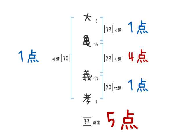 天運![]() | 大亀義孝さんの天運は19画の1つ星!優れた才能を持ちますが、協調性が足りないことも。周りの人と協力する事を意識しましょう。 家系が持つ宿命的な運勢を表します。祖先から受け継いだ苗字ですので自分の力が及びません。家柄を象徴します。 |