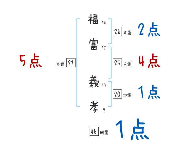 外運![]() | 福富義孝さんの外運は21画の5つ星!統率力がある。独立し成功する。名誉を手に入れる。 生活面を象徴する運勢です。外部から受ける影響力を表し、結婚運、家庭運や職場、環境への順応性を表します。 |
