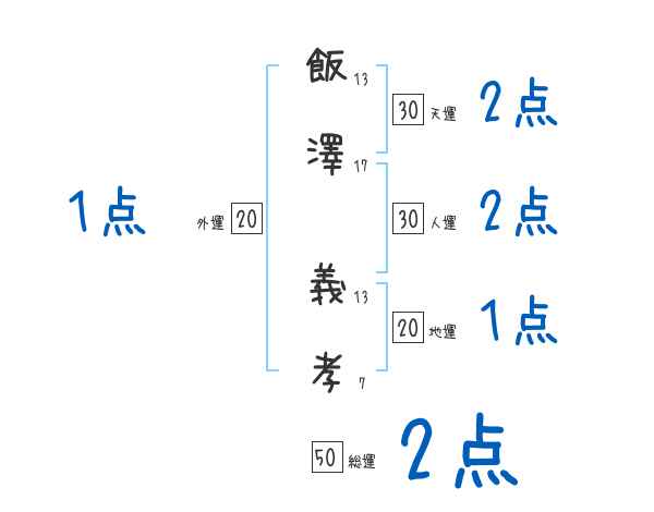 天運![]() | 飯澤義孝さんの天運は30画の2つ星!浮き沈みの激しさに注意しましょう。 家系が持つ宿命的な運勢を表します。祖先から受け継いだ苗字ですので自分の力が及びません。家柄を象徴します。 |