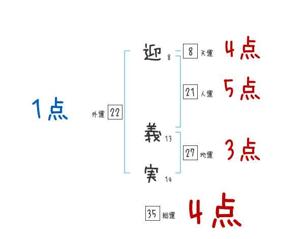 天運![]() | 迎義実さんの天運は8画の4つ星!勤勉家。根気強く努力し成功する。忍耐力がある。 家系が持つ宿命的な運勢を表します。祖先から受け継いだ苗字ですので自分の力が及びません。家柄を象徴します。 |