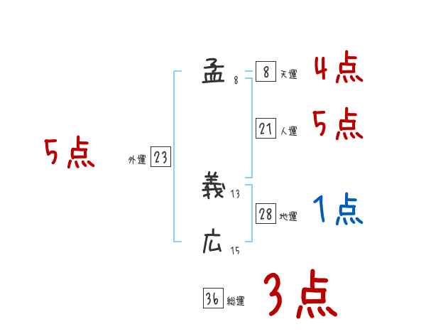 外運![]() | 孟義広さんの外運は23画の5つ星!想像力に優れ活力がある。一代で成功し名誉を手に入れる。 生活面を象徴する運勢です。外部から受ける影響力を表し、結婚運、家庭運や職場、環境への順応性を表します。 |
