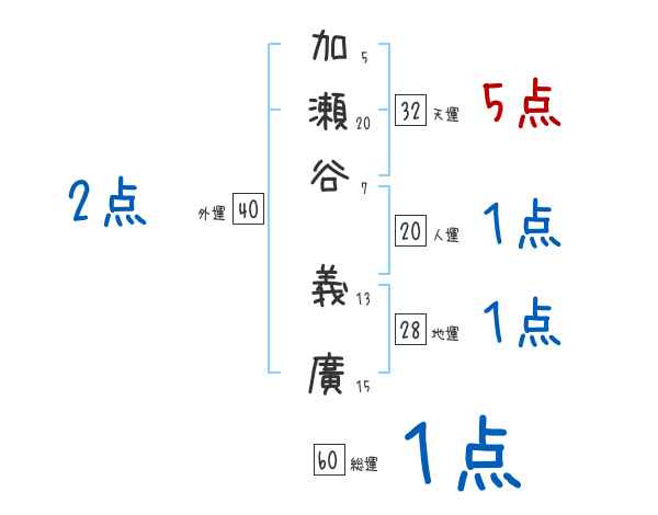 天運![]() | 加瀬谷義廣さんの天運は32画の5つ星!柔軟性があり成功する。チャンスが多く金運が良い。 家系が持つ宿命的な運勢を表します。祖先から受け継いだ苗字ですので自分の力が及びません。家柄を象徴します。 |