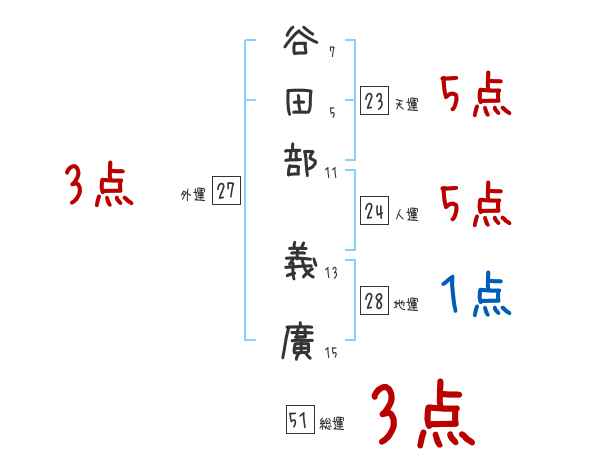 地運![]() | 谷田部義廣さんの地運は28画の1つ星!家庭環境に注意。スポーツで活躍できる能力があるかも。 個性を表す基礎的な運勢です。性格形成や対人関係、行動力など家庭環境に影響されます。主に誕生してから20歳くらいまでの若年期の運勢を表します。 |